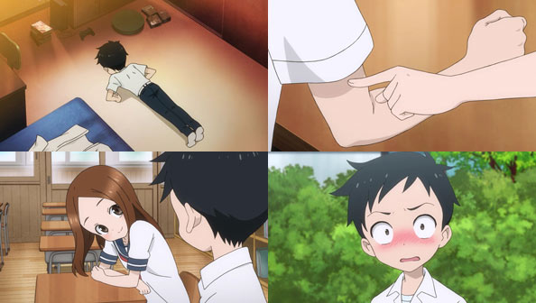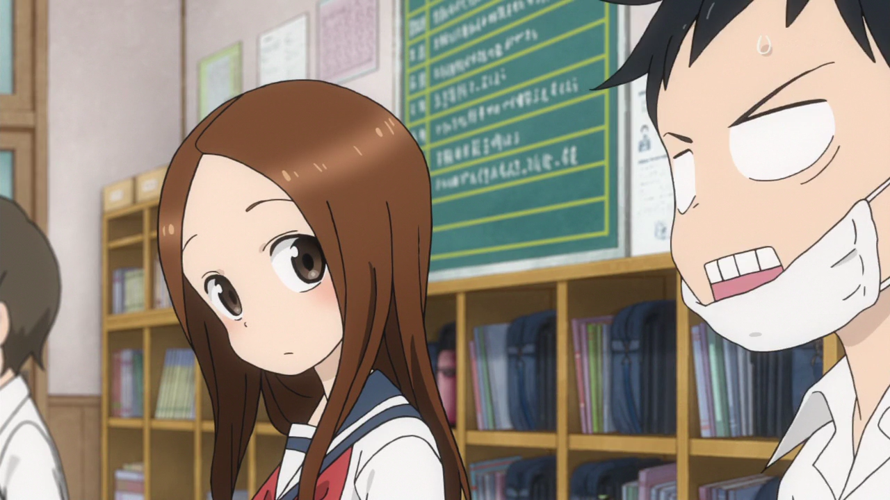 Nishikata se altera y alza la voz, provocando que el maestro le lance una tiza y le regañe, Takagi se ríe al ver que el mismo siempre cae enganchado en sus propias artimañas, y se deje llevar por sus emociones, causándole siempre que el maestro lo reproche, por sus constantes escándalos en el aula.