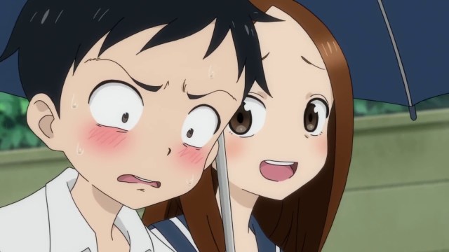 Luego Nishikata se esta mojando parte del hombro, ella lo nota y decide acercarse mas para que el no se moje, avergonzado cada vez mas, ella le pregunta como se llama esa situación que están, cuando comparten un hombre y una mujer paraguas bajo la lluvia, y al unir los labios un chico y una chica, Nishikata nervioso susurra las respuestas. Deja de llover, Nishikata va de camino a su casa, Takagi finge que no se acuerda por donde es su casa, haciendo que Nishikata decida acompañarla a su casa, diciendo dame un respiro.
