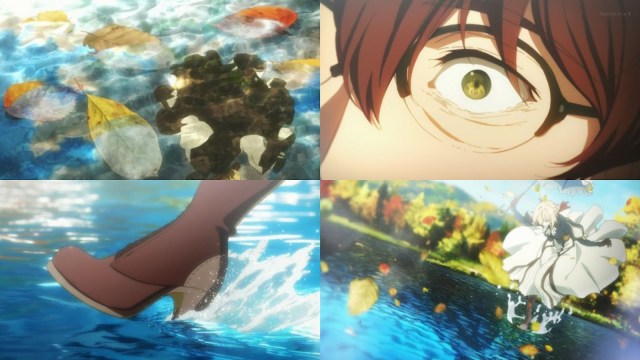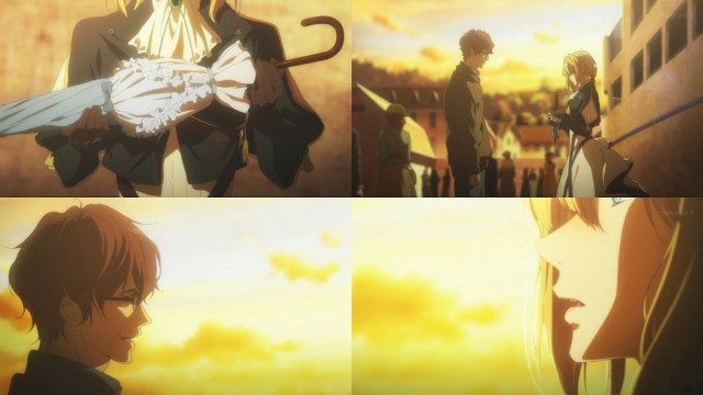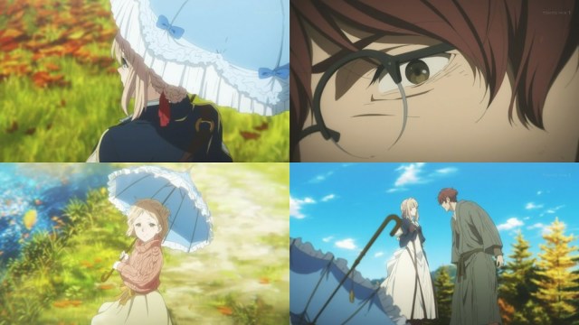 Desde la segunda planta de su hogar observa a Violet desde la ventana, la cual ella utiliza el paraguas contra el sol, esta escena abrió el telón de sus recuerdos más fatídicos, por lo que entra en enojo con Violet queriendo que ella se marche y olvide todo, ella le recuerda sobre la obra que se debería terminar, pero el escritor camina hacia la casa sin hacerle caso, cuando Violet siente ese momento el que le han sucedido caso similares de acuerdo a los sentimientos de las personas, ella toca el tema de que si algún problema que le remuerda la mente le pasa, entonces el escritor se detiene y escucha por lo que Violet le dice de que no es buena en entender los sentimientos de las personas ya que es inexpresiva,en muchas ocasiones, pero se preocupa por aprender de ello que se esfuerza en el diario vivir.