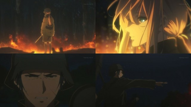 Luego la central decide enviar a Violet a la guerra, por lo que Gilbert se rehúsa a enviarla ya que es muy inestable para ello. Sin embargo, le es ordenado obligatoriamente no quedándole más opción que llevarla consigo mismo, durante la operación estratégica avanza de noche para un ataque sorpresa, un soldado enemigo está en las cercanías pero Violet lo elimina logrando que sus aliados avancen atacar.