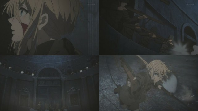 Al avanzar hacia el castillo enemigo Hodgins y Violet entre un puno de soldados son sorprendidos por una emboscada, Violet se percata salvando a Gilbert mientras que los otros soldados son exterminados, Violet sale del muro de la esquina y dispara a los adversarios, ella y Gilbert avanzan hasta la cima, es cuando Gilbert da la señal con la bengala, desde la distancia Hodgins ve la señal y da la orden de que el ejército procede avanzar, de pronto uno de los enemigos le dispara a Gilbert quedando Violet sorprendido de no haberlo visto venir a tiempo.