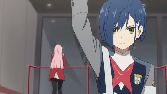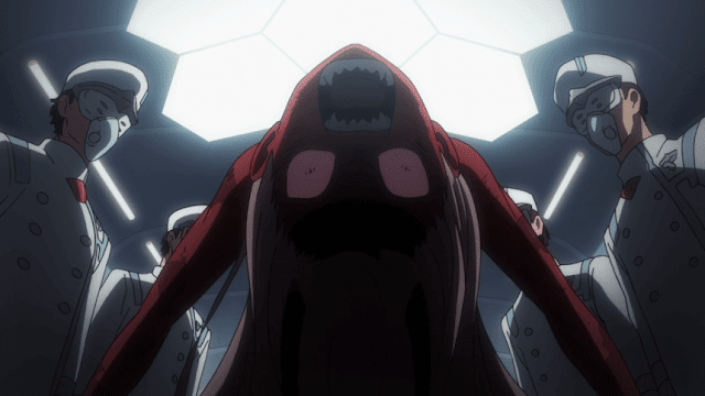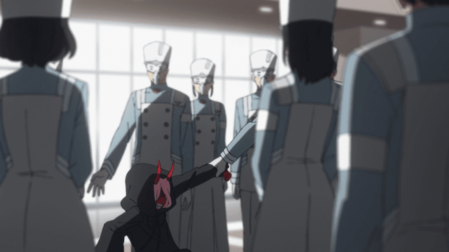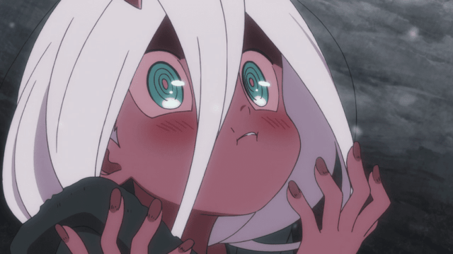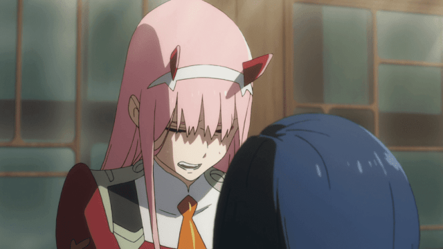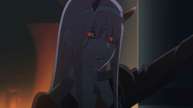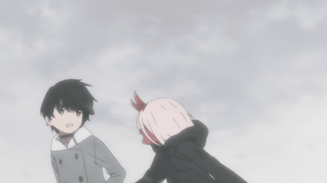 Hiro despierta y la ve aconsejándole no comérselo, tratando de acariciar su cabeza, pero la niña piensa que es como los adultos y le muerde,pero cuando Hiro le acaricia la cabeza, la niña recuerda a la mujer que al principio la cuidaba y le suelta, Hiro ve su dígito en la pierna de la niña, pareciéndole extraño un dígito de un solo número, lo cual le otorga a ella el nombre de Zero two.
