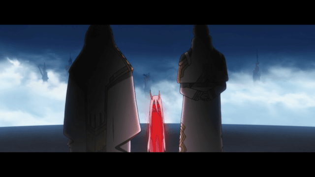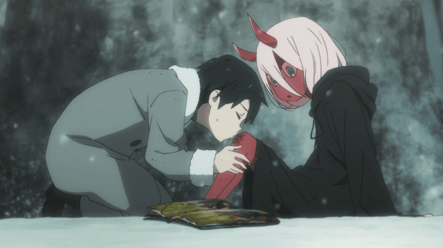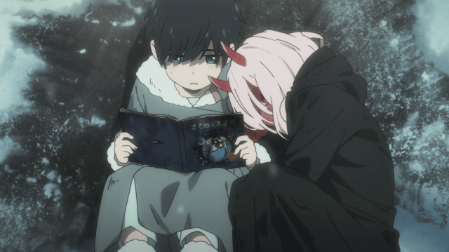 Hiro trata de protegerla pero es golpeado en la cabeza por una arma de fuego, lo cual se llevan a Hiro y Zero two. Regresando al actual momento Hiro despierta de los recuerdos de Zero Two, recordando escenas importantes de sus vidas pasadas, y llorando al abrir la mente de los recuerdos y preguntándole a Zero Two eres la nina del libro ilustrado, Zero Two voltea la mirada hacia el desbordando lágrimas de alegría de sus ojos al saber que Hiro es el chico de aquella vez.
