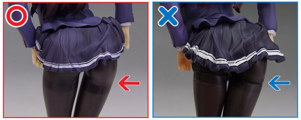 La figura oficial de Good Smile muestra a Utaha levantándose las medias mientras se prepara para la escuela. La figura del bootleg imita la misma pose, pero hay algunas diferencias obvias si sabes dónde mirar. En las imágenes de abajo, la figura oficial se muestra con una «O» roja mientras que el bootleg se muestra con una «X» azul.