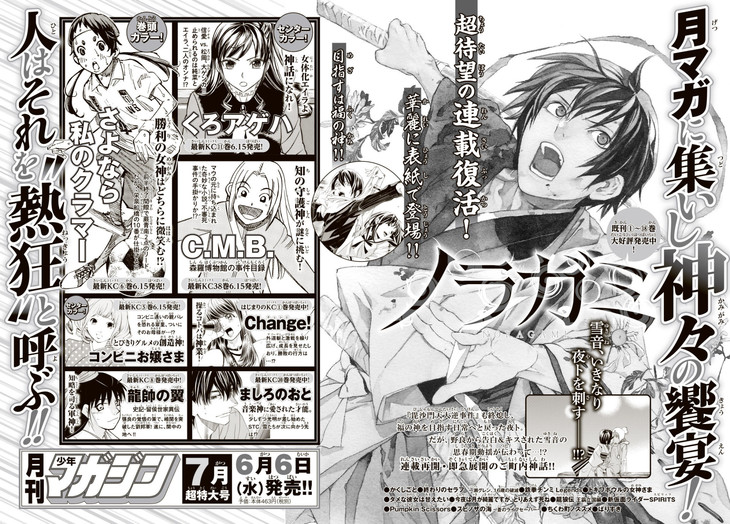 El Manga entró en una pausa prolongada el año pasado debido a que el miembro de Adachitoka se está recuperando de una enfermedad. Kodansha reveló el viernes que Adachitoka reanudará su manga Noragami: Stray God en el número de julio de la revista el 6 de junio. El manga sufrió un paréntesis en mayo de 2017 para que uno de los miembros de Adachitoka pueda recuperarse de una enfermedad. El manga aparecerá en la portada del número de julio.