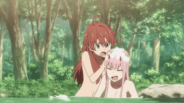Luego Kokoro se avergüenza disculpándose por ello para irse corriendo, mientras que Mitsuru se queda tranquilo y al mismo tiempo sorprendido. En otro lugar Hiro camina por el bosque junto a Zero Two mientras platican, cuando Zero se detiene para saber que tipo de árbol es el que ella ve, Hiro le explica que es de flores de cerezos y florecen del color del pelo que ella tiene el cual menciona que es hermoso, Hiro intenta acercarse al más pero se espanta cuando Zero reacciona sorprendida al recordar que tiene que reunirse con las demás chicas para bañarse. Las chicas mientras se banan, Miku le habla sobre el corte de pelo de MItsuru, Kokoro se muestra sospechosa por lo que Miku sonriendo se percat de que fue ella quien lo hizo, de pronto e n medio de ello, miku lava el pelo de Zero Two, esta menciona alguna frases halagadoras que Hiro le menciona a ella, siendo algo cursi para las demás.
