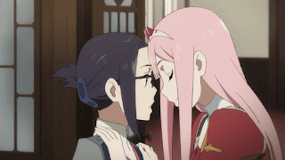 Zero cambia de idea y decide que Hiro le observe mejor, Zero se fija en los pequeños cuernos que posee Hiro notando que han crecido más, pensando ella que podría deberse a que Hiro pilotea con ella en Strelizia o que el haya bebido su sangre anteriormente durante sus infancias de niños. En parte Zero se siente culpable pero aun así está feliz de que Hiro le acompañe por lo que se besan, Hiro solo piensa en que cada vez se parece mas a ella. Luego Zero Two pregunta por el dibujo que realizó Hiro, él está nervioso de enseñarlo pero Zero lo observa riéndose de su dibujo, Hiro está muy avergonzado y Zero Two se percata de que ello por lo que decide aprobar el dibujo y Hiro se alegra de ello. En otra parte Kokoro sale del baño sorprendida de encontrarse de repente con uno de los Nines apunto de caerse es sujetada por el Nine. Kokoro le agradece y se despide cuando la Nine encuentra en el baño, un libro que poseía Kokoro sobre el parto de una madre, llevándoselo a Alpha, al terminar de leerlo piensa en advertirle a Papá.
