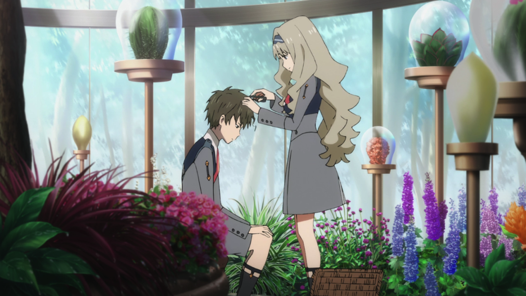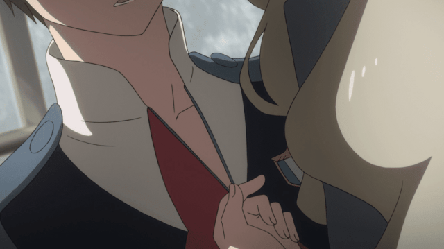 Por otro lado Goro conversa con Hiro sobre volver a pilotar los FranXX, sorprendido de que Hiro no sea el más desesperado en ello, ya que solía querer dirigirlo más los demás, Mitsuru le pide a Kokoro que le corte el pelo, cuando este empieza a charlar con ella sobre su pasado con Hiro siendo su antigua promesa, Kokoro le pide que se fije en su apariencia, ella le sonríe, pensando Mitsuru que se ve extraño cuando Kokoro le hace saber de que se ve apuesto y mencionando la aclaración de la opinión personal de que ella piensa sobre lo antes mencionado por el. Mitsuru le agradece a ella, sintiéndose cada vez mejor pensando que puede lograrlo todo gracias a Kokoro, mencionando lo amable que ella es y buena con las manos al cortar el pelo, Kokoro al escuchar ello, no puede evitar acercarse a él, por lo que besa a Mitsuru.