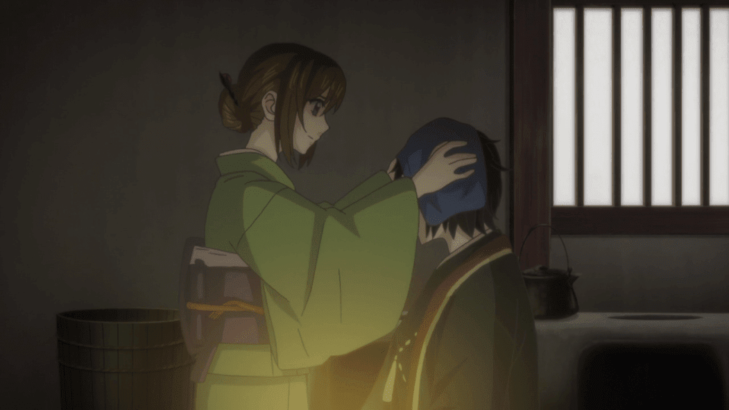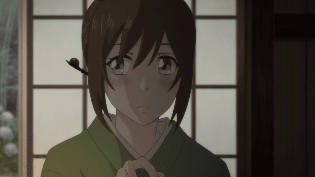 Cuando llegan a una aguas termales, Aoi observa huevos entre las aguas lo cual la entusiasma mucho queriendo preparar un platillo con ellos, ya que son originarios de la mismas aguas termales, Tenjin se alegra de verla con tales reacciones y la lleva a una cabaña donde le seca el pelo, Aoi le ordena a Tenjin sentarse a un lado para secarle también el pelo cuando Tenjin la halaga con frases motivadoras lo cual sonrojan a la chica, ella se percata de lo mojado que está el kimono de Tenjin solo para haber evitado que ella se mojase cuando ellos caminaban juntos con un solo paraguas bajo la llueva, de pronto Tenjin se queda fija su mirada en Aoi por lo que ella se avergüenza preguntándole sobre ello para luego saber de que el nunca se había percatado de tal ángulo en ella del rostro en ella.