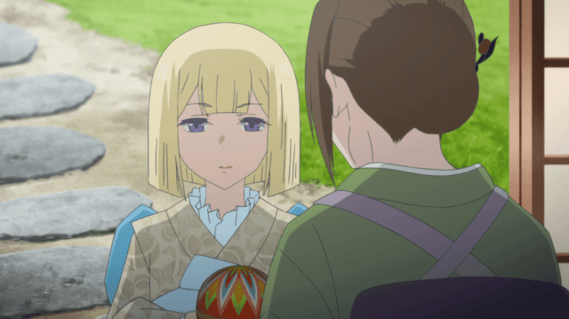 Por lo que cambia de opinión y busca un collar hermoso el cual lleva incrustado en su interior un fuego de ogro de Tenjin, siendo un amuleto de suerte para ella y la deja marcharse donde ella quiera, lo cual él le pide el bento a ella, Aoi se lo entrega al el dejarla ir con Ginji en busca de ingredientes a la tierra oriental cuando de pronto un gran estruendo se escucha atemorizándola por ello, debido a que esto le trae malos recuerdos de su infancia, Tenjin se percata de lo muy atemorizada que está Aoi prometiéndole que nada más la asustara tal como mencionó un Ayakashi varios años a ella, luego de todo ello Tenjin encamina a Aoi a su posada, durante la noche ella recuerda cuando su madre la abandonó durante su niñez.