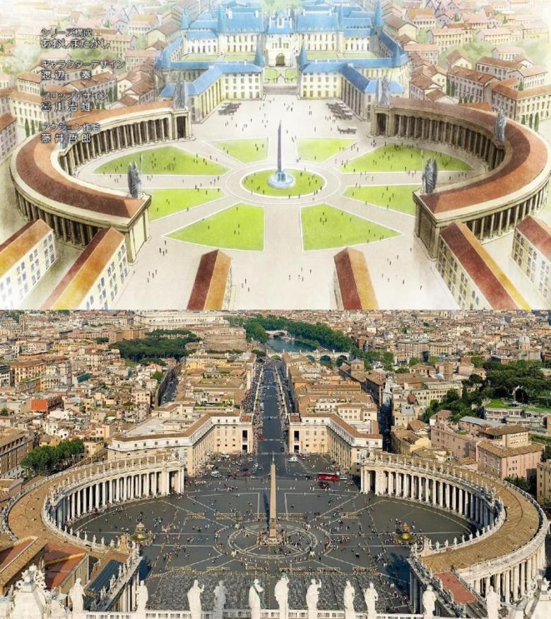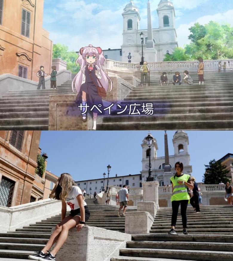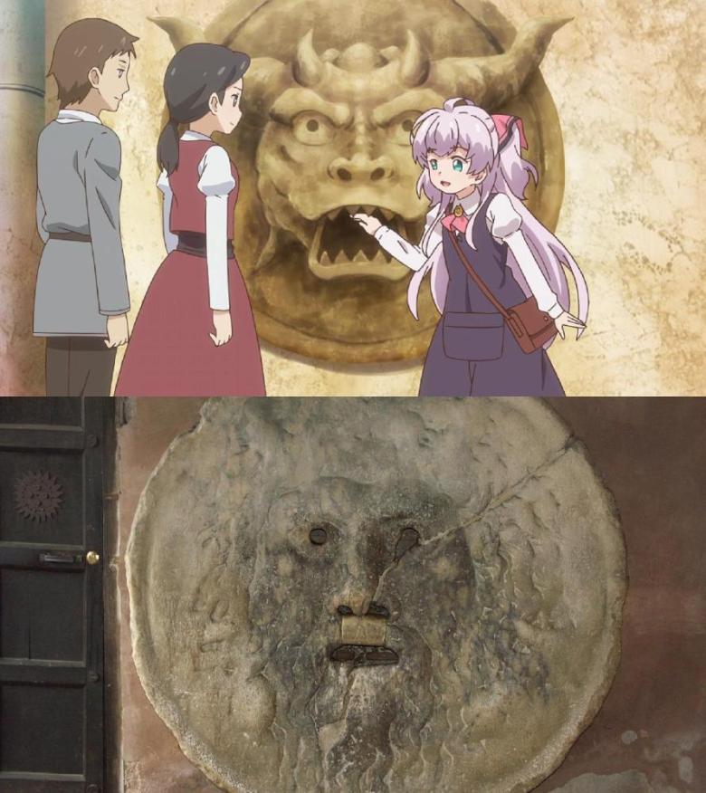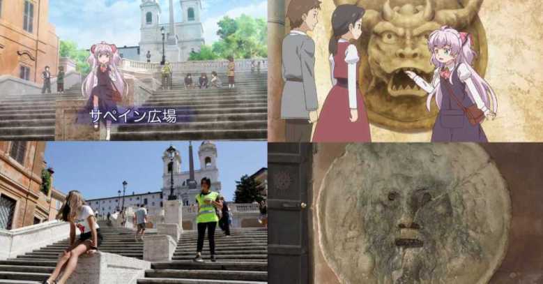 Además, pensé aquí que había sido transportada a un mundo de fantasía, pero no, ¡fue transportada a Italia! Evidentemente el título es una broma, muchos escenarios de uso de anime basados en ubicaciones reales, y resulta que algunas localidades de la ciudad en la que Mile está en el otro mundo están basadas en Italia.
