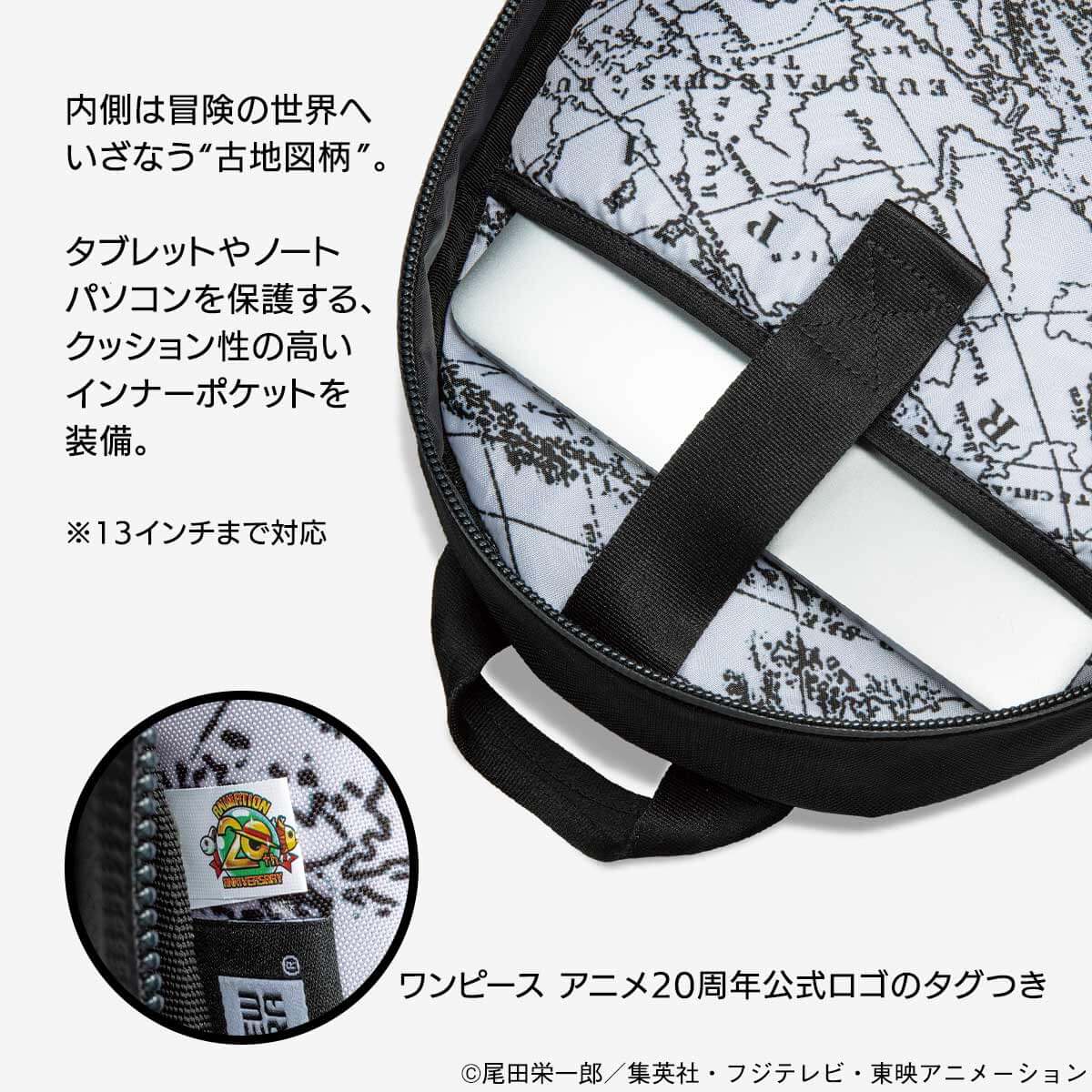 La mochila se inspira en los Piratas del Sombrero de Paja y es combinada con el estilo icónico de la moda urbana de la Nueva Era. El bolsillo exterior de la bolsa anuncia delicados bordados del logotipo del cráneo de la tripulación, así como el nombre «SOMBRERO DE PAJA» en mayúsculas.