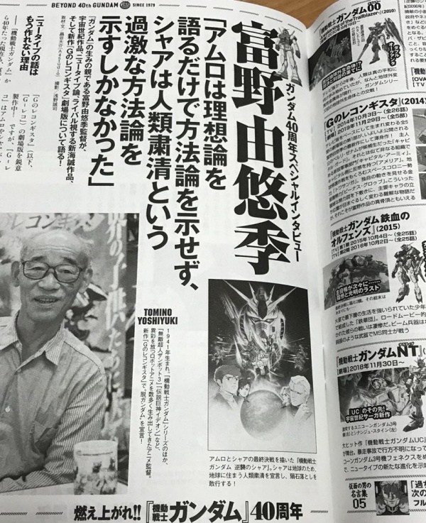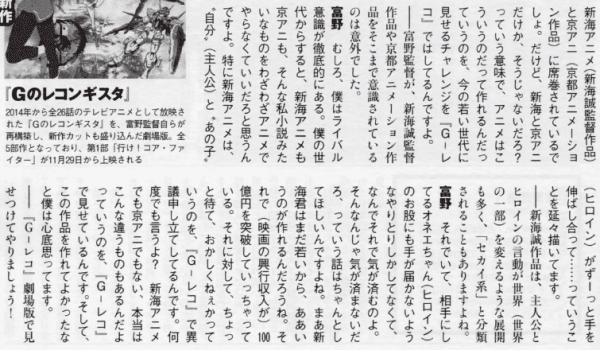 Tomino menciona que creó Gundam: Reconguista en G para recordar el anime que vio cuando era niño. Sin embargo, estas obras fueron reemplazados por los trabajos de KyoAni y Makoto Shinkai. Luego le preguntan qué piensa sobre su trabajo y Tomino dice: «Los veo como mis rivales, desde la perspectiva de mi generación, no tienes que trabajar duro para crear un anime que parezca una novela introspectiva».