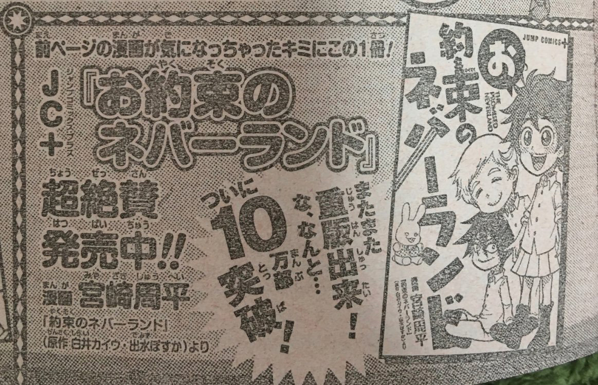 Shueisha presentó este 1 de diciembre que el manga Oyakusoku no Neverland de Shuhei Miyazaki, un spin-off cómico del manga del autor Kaiu Shirai y el ilustrador Posuka Demizu, cuenta con más de 100,000 copias en ventas. El manga empezó su estreno el 11 de enero y finalizó el 4 de junio de 2019 con 12 capítulos.