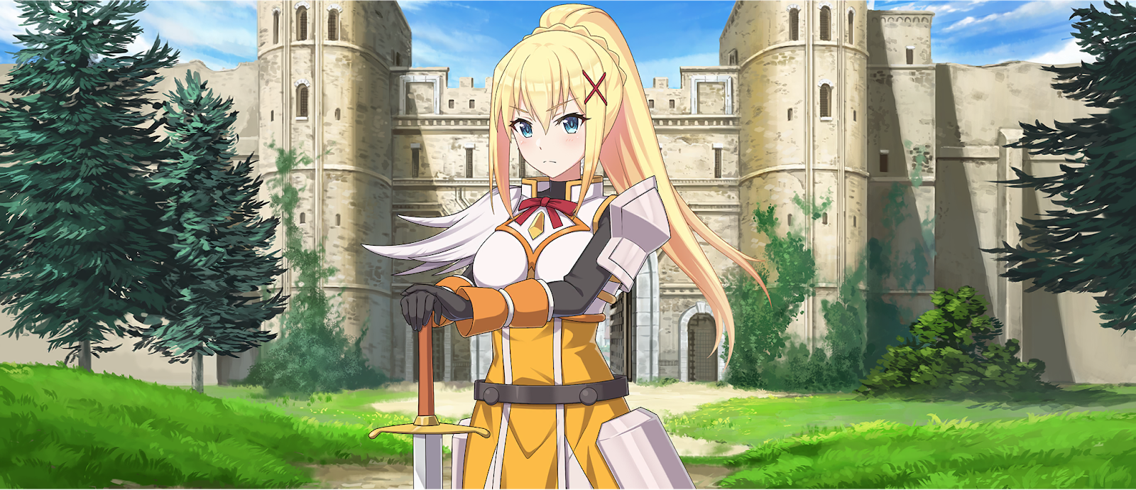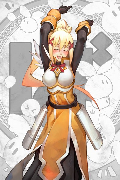 Lalatina Dustiness Ford, generalmente conocida como Darkness, es una de las tres protagonistas femeninas de la serie KonoSuba. Ella es una cruzada con tendencias masoquistas que se une al partido de Kazuma desde el principio. Darkness, una joven alta y hermosa, da la apariencia de una belleza fresca. Ella está bien dotada y también tiene ojos azul claro y cabello rubio largo y liso, generalmente mantenido en una cola de caballo atada con una trenza y pinzas para el cabello rojas aseguradas a ambos lados de su flequillo.