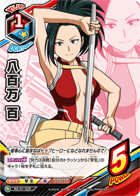 Momo, conocida como Heroína Creación: Creati, es la vicepresidenta de Clase 1-A en UA High School, donde ingresó mediante las recomendaciones oficiales y está entrenando allí para convertirse en Pro Hero. Ella es una adolescente bien alta con un físico muy maduro, considerando su edad. Durante el horario escolar, usa el uniforme que consiste en una chaqueta gris con rayas azul verdosas, una camisa blanca formal, corbata roja, falda plisada azul verdosa, calcetines negros hasta la rodilla.