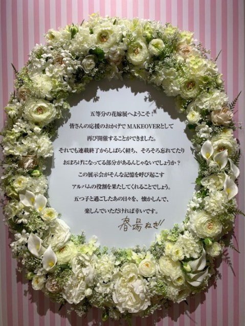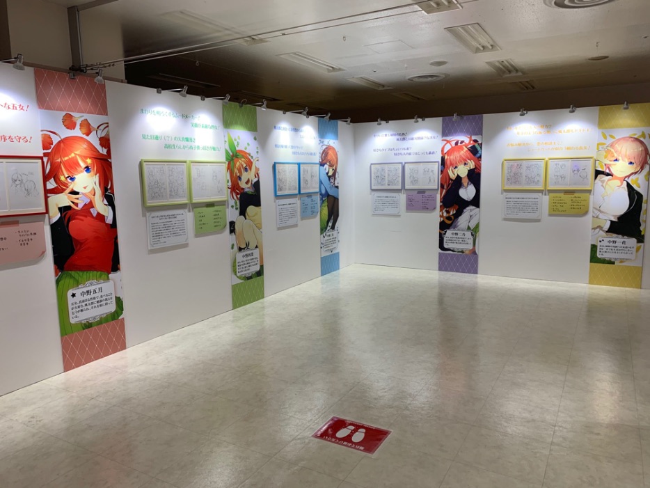 En la entrada de la exposición hay un mensaje y firma de Negi Haruba, el autor e ilustrador de la serie de manga The Quintessential Quintuplets. Muy cerca se encuentran los mensajes de las cinco hermanas, así como un video especial, que sólo se pueden ver asistiendo a la exposición. A lo largo de la exposición hay numerosas muestras que recuerdan a la serie, así como entrevistas con el autor que se pueden leer, y un montón de visuales ilustrativos de los personajes.