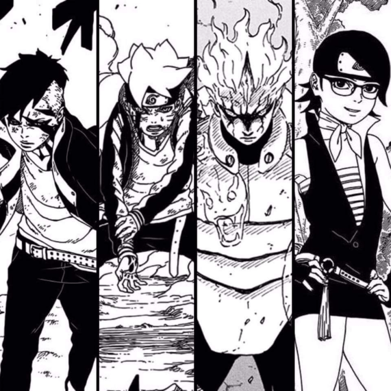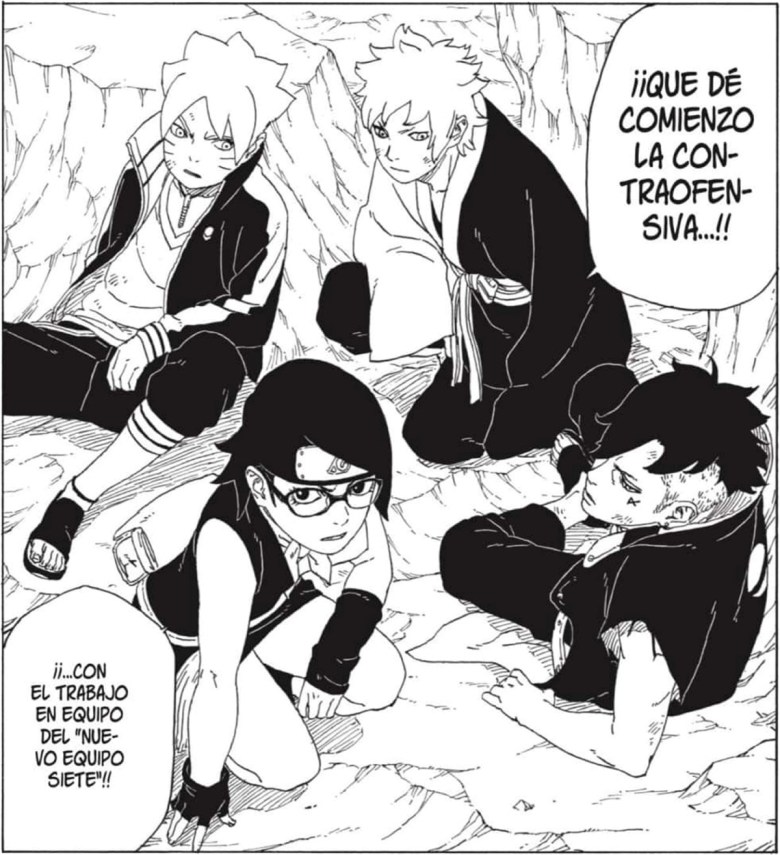 Evidentemente, es notable el parecido de Shikadai en las tácticas de su padre, pero el desarrollo de Sarada como líder es más natural, avanzada y posee un desenvolvimiento más agudo en cuanto a decisiones inmediatas bajo gran presión… Un caso ejemplar de esto es la operación rescate de Naruto por el nuevo equipo 7. A partir, del capítulo 43 del manga, gracias al poder de la marca llamada »Karma», en las manos de Kawaki y Boruto logran abrir un portal a otra dimensión donde se enfrentan a un inminente enemigo poderoso e interno de Kara, esté custodia a Naruto quien ha sido derrotado y sellado por el líder de la organización Kara »Isshiki Otsutsuki».