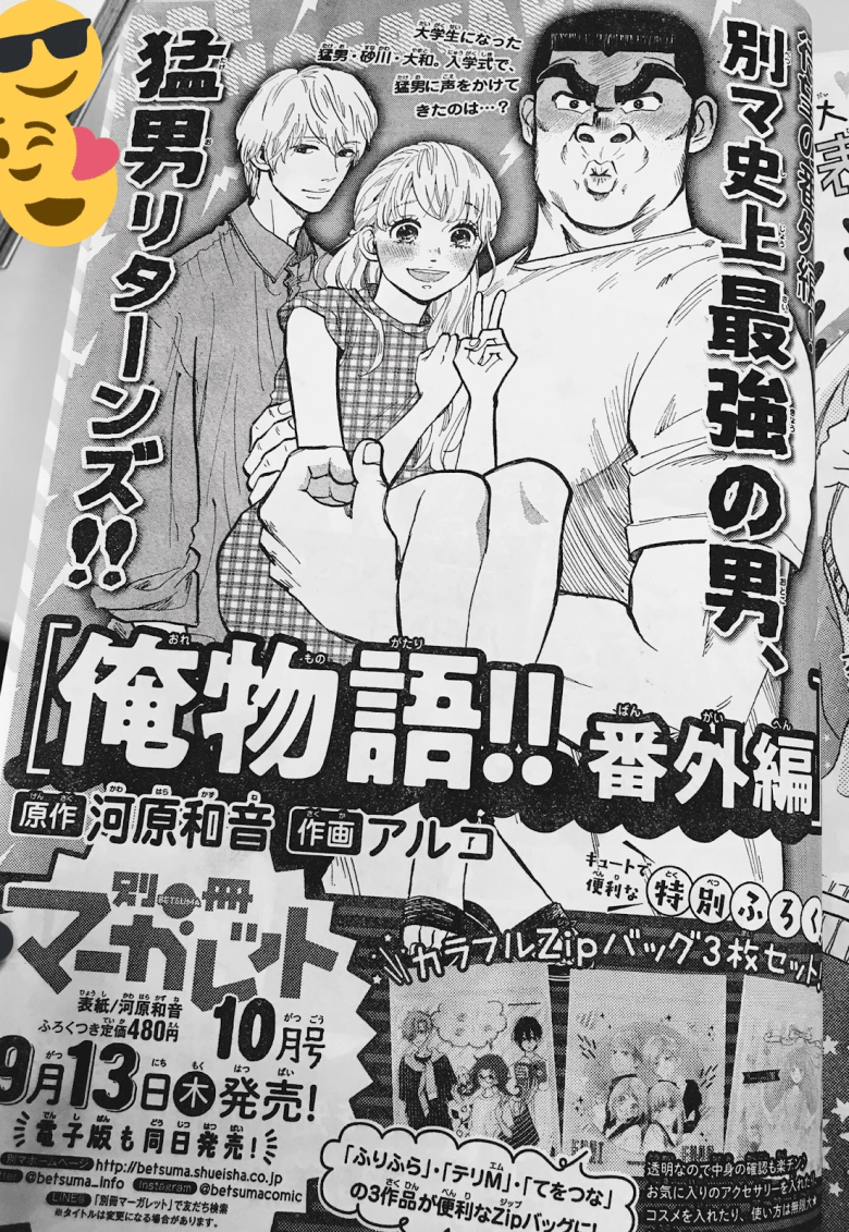 El número de septiembre de la revista Bessatsu Margaret de Shueisha anunció que el manga Ore Monogatari!! de Kazune Kawahara y Aruko añadirá un episodio adicional en el siguiente asignatura del informe, lo cual estará a la venta el 13 de septiembre. El episodio tendrá un total de 60 páginas, otorgando como la primera pagina de todas a color.