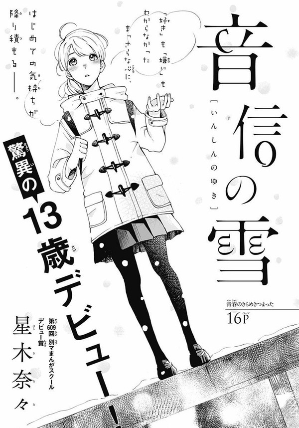 今月売りの別冊マーガレット3月号に載ってる13歳デビュー驚異の新人・星木奈々さん(ちゃん?)「音信の雪」は凄い!13歳にしてこの画力、16ページというコンパクトな中で見事に仕上げる構成力。そして面白い。長い漫画編集人生、ここまでの13歳は見たことない。真っ直ぐに育ってほしい!マジ凄い。 pic.twitter.com/z8ol62OrPT— みふもとうとりあ (@izumonoari) 14 de febrero de 2019