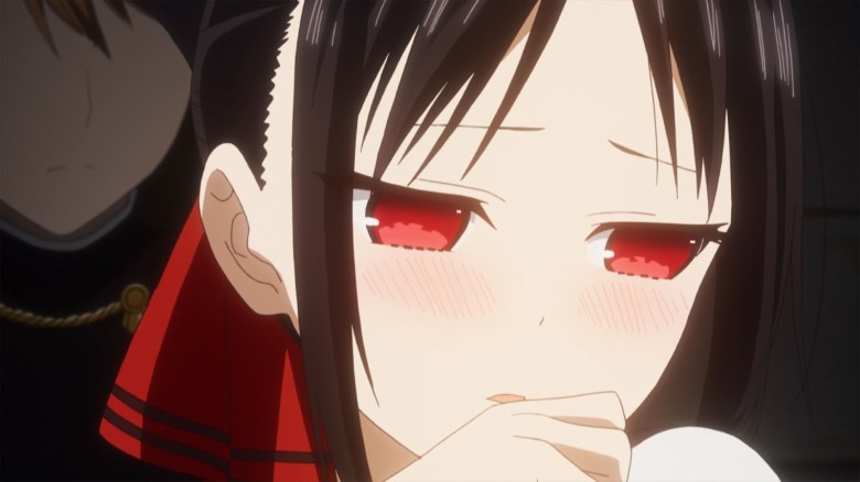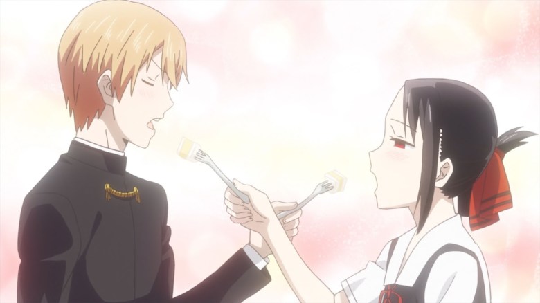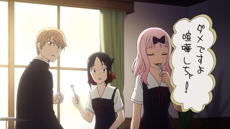 A punto de ambos culminar ofreciéndose mutuamente el pastel, directamente dándole el uno al otro, Chika llega y se come le pastel. En otro orden, Kaguya solicita un consulta amorosa a la estudiante Kashiwagi Nagisa. Puesto que esta último tiene novio. Kaguya ofrece sus versiones y aunque finja que la situación problemática no es de ella. Nagisa se percata de que si es si situación. Mientras que Miyuki Shirogane conversa con Ishigami de acuerdo al mismo caso que Kaguya. Solo que en este caso, Ishigami se deja llevar y comienza a emocionarse y por ahí se va insultando.