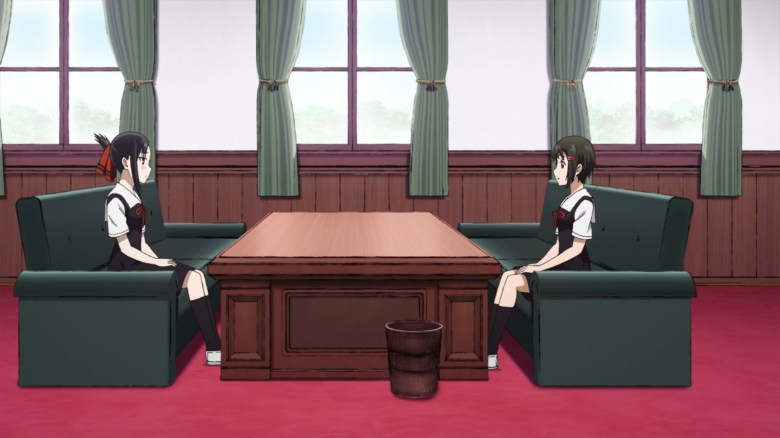 Entramos en escena con un ambiente súper denso. En el que Shirogane y Shinomiya Kuguya se baten un a intensiva serie de discusiones por querer que el otro acepte un trozo de pastel. Es entonces, que tras un cambio de escenario, una retrospección no muestra como ha sucedido todo esto. A través del director de la escuela a ofrecido pastel. Sin embargo, solo hay dos bizcochos y ellos son tres. Por lo que Shirogane le ofrece uno al tesorero Ishigami. Mientras que el restante es ofrecido a Kaguya la cual no acepta. Dado que quiere dárselo a Shirogane. De igual forma, no aceptan.