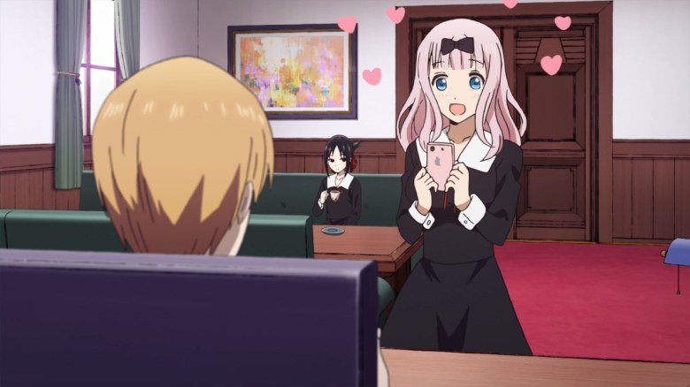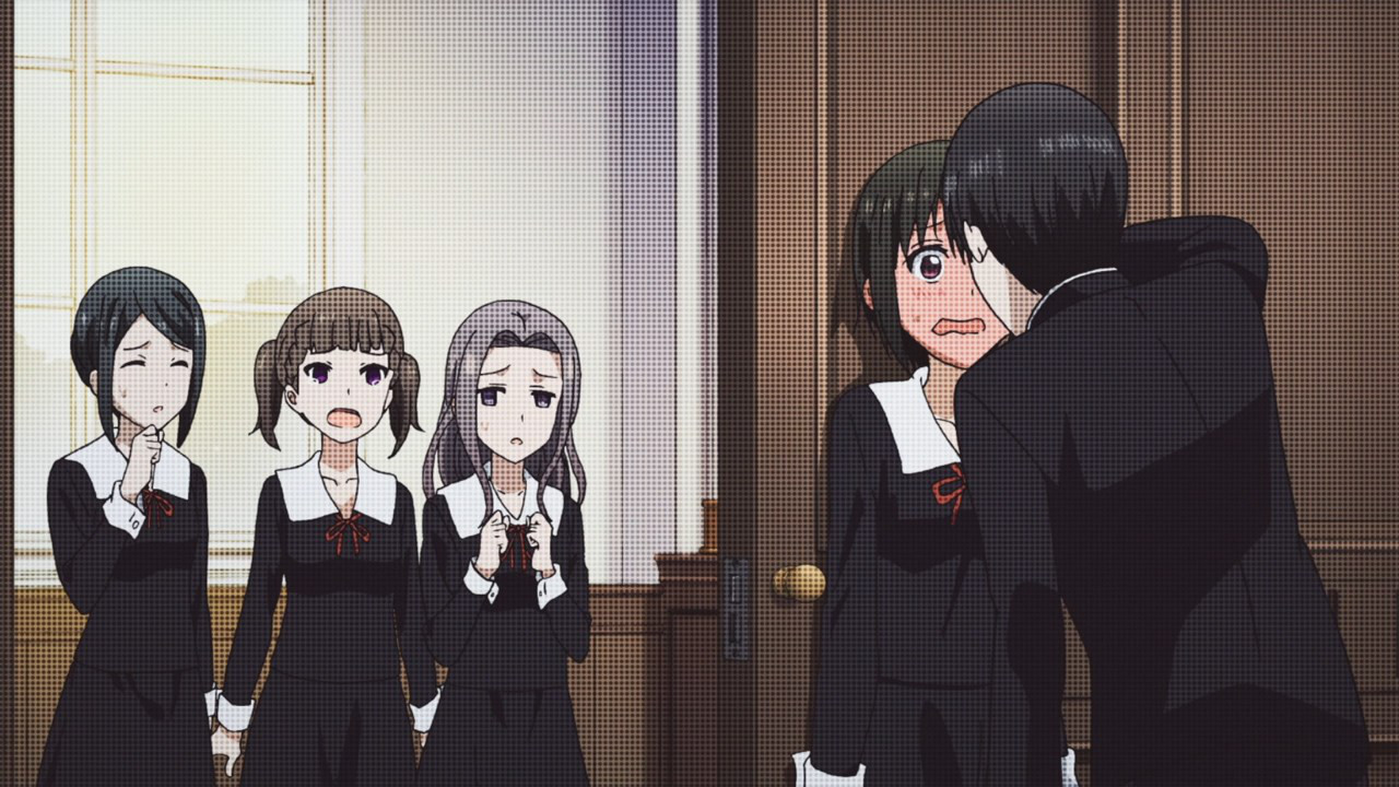 Apenas comenzando y ya están entrando en la zona de sus rivalidades. Kaguya y Miyuki muestran tantas reacciones jocosas que hay bastante de ue sacar escenas para pasar un buen rato de risa. Mientras que la secretaria, Chika, quien imaginarai que para tan amable y dulce chica, se escondería una amante de las cosas lúgubres y macabras. Situación que dejo estupefactos y callados a los prefectos del consejo. En otro caso, la inesperada reacción de Miyuki ante Kaguya al responder y aconsejar a un estudiante sobre caso románticos, ha dado a conocer algunos momentos divertidos.