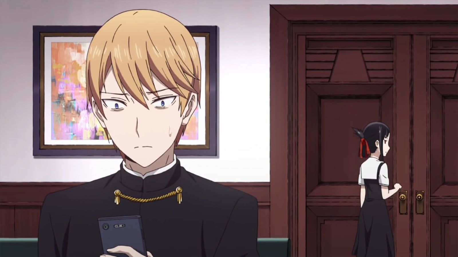 Shirogane se acerca a Kaguya y aprovecha para descubrir sus debilidades. Con una serie de preguntas personales. De pronto, Kaguya sujeta a Shirogane y ambos terminan juntos en la cama, en contra de la voluntad del chico. Lo que parece uan escena provocativa para el presidente, termina en quedarse dormido por la falta de sueño. Al igual que Kaguya, para cuando este despierta, regresa ala normalidad y se sorprende de ver a Shirogane en su cama y lo lanza contra el suelo. Shirogane se ve en aprietos y se ve obligado a huir de los ataques de Kaguya contra el.