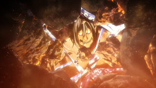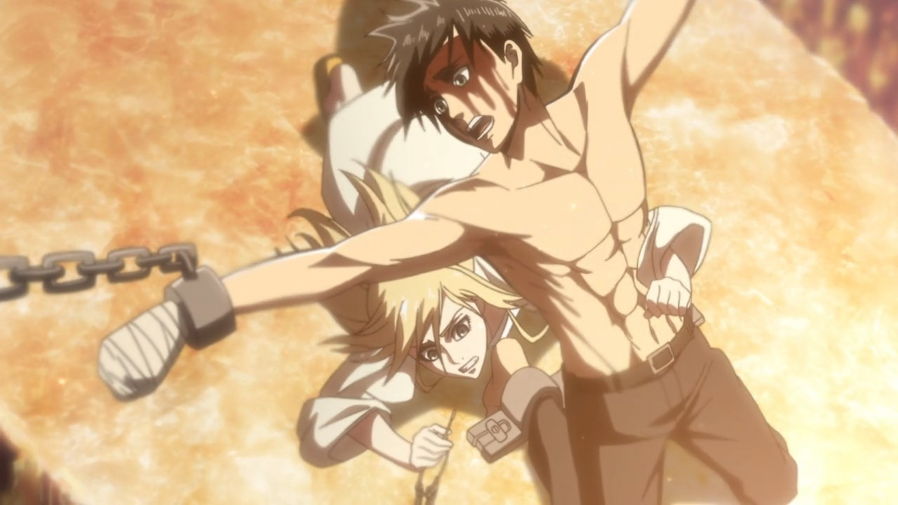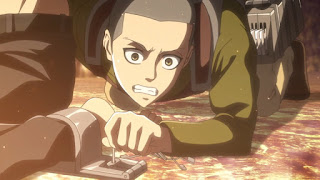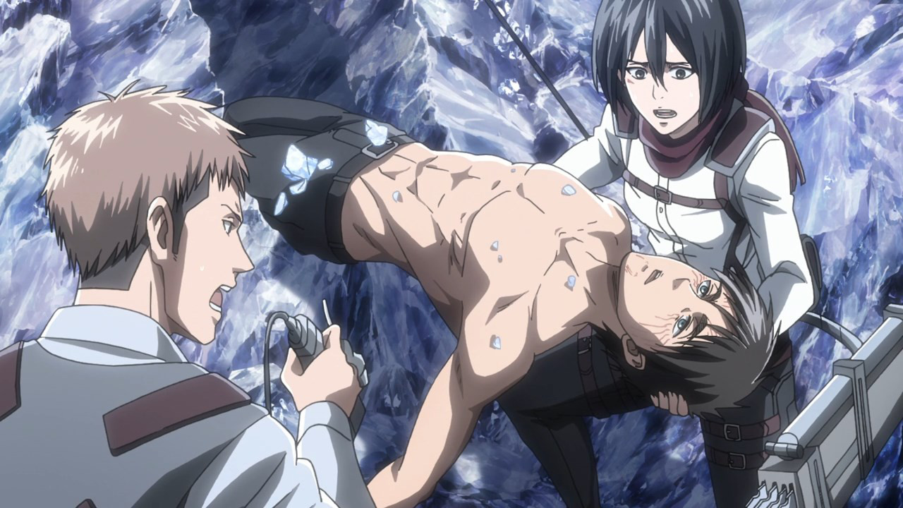 Eren queda petrificado de temor por su impotencia cuando Levi le recuerda cual es su desicion y Eren opta por transformarse en titan y utilizar sus poderes de cristalización con ello salvando a sus compañeros del derrumbamiento de la cueva a causa del titán de Rod Reiss, en otra parte Armin y otro escapan con Hange mientras el suelo se abre en dos, Levi y los demás liberan a Eren de su titán, Sasha llega liberando sus punto de vista de la situación de Eren.