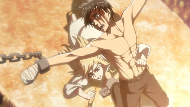 Entre Levi y su escuadrón son bloqueados de escapar por Traute y sus hombres, de pronto una gran luz y movimientos azota el lugar, Historia trata de liberar a Eren cuando es lanzada por una fuerte refaga de viento, Mikasa llega y la sujeta a tiempo. Levi y Connie liberan a Eren de las cadenas, Traute y los suyos peligran ante el temblor.