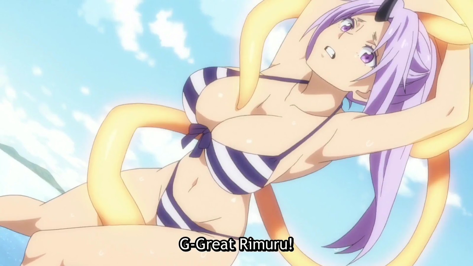 Por lo que, Gabiru termina golpeado por ella. Finalmente, la búsqueda de tal elemento especial inicia y para ello, cada uno usa un traje de baño. Aunque, de la forma más divertida demuestran sus tarjes. De pronto, la poderosa Señora Demonio »Milim Nava», llega tras percatarse del picnic de Rimuru y sus amigos. Rimuru no le queda de otra que insertarla en el grupo y emprender sus natasiones en la búsqueda. De repente, algo extraño jala Rimuru hacia las profundidades. Por lo que, utiliza sus técnicas para liberarse, pero los demás también están siendo atacados.