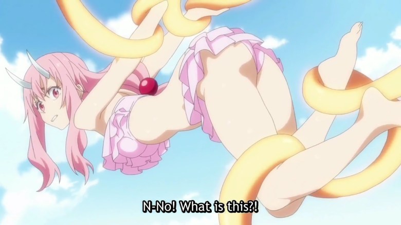 No obstante, de la forma más extraña y divertida con bastante fanservice a través de las extremidades del monstruo marino que los ataca. En poca palabras, todo un desmadre. El Slime se sumerge hasta las profundidades hasta el monstruo para ver qué es lo que lo está haciendo reaccionar de tal manera que le parece sospechoso a Rimuru. De inmediato, el Slime ve la bola de arroz de Shion cerca del monstruo, y se percata de que tal alimento le cayó mal al monstruo marino. Por lo que, Rimuru utiliza uno de sus poderes y logra librarlo del malestar por tal almuerzo o lo que sea que es… xD