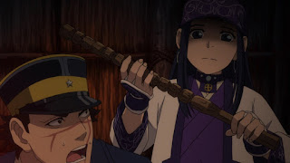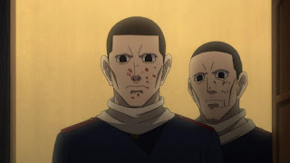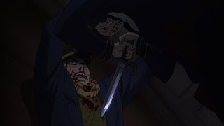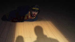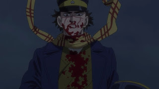 Shiraishi se oculta tras un cajón, ya que los hermanos volvieron para amatra a Sugimoto debido a que el guardia que viliba la puerta se fue pensando que había un ladrón cerca para robar los caballos, Sugimoto ya tenía previsto que los odiosos hermanos volverían, sin embargo entre ellos uno vigila afuera para avisar, mientras que el otro utiliza una bayoneta para eliminar a Sugimoto debido a que si usa una arma de fuego los demás se darán cuenta de ello, por lo que el que lo hará es sorprendido cuando Sugimoto esta liberado de sus cuerdas y tiene la bayoneta con el que pensaba el soldado que cargaba pero se percata que no es así y termina exterminado por Sugimoto. De inmediato los demás llegan para evitar que el último hermano pelee con Sugimoto y observa a uno de los muerto por él, mientras que Sugimoto se ve muy grave, como con los intestinos afuera, el teniente Tsurumi lo observa mencionando que su vida pende de un hilo.
