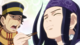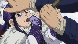 Luego de profundizarse en la historia y cultura de la tribu Ainu nuestro protagonista Sugimoto decidió aventurarse solo sin la ayuda de Asirpa para dejar una imagen en la aldea, sin embargo esto no causo lo que esperaba y termino por ser rescatado por Asirpa la cual al fin y al cabo le dio su merecida lesión por ello, aunque ella suele ser muy seria ha demostrado lo solitario que era antes de conocer a Sugimoto demostrando Asirpa su gran sentimiento de atracción hacia el soldado Sugimoto. Por otra parte esa Asirpa si que sabe rematar con su excesivas muecas y reacciones, en especial cuando intentaba rastrear a Sugimoto co nu calcetin con la ayuda de su lobo, pero encuentra a uno de los convictos, y termina ella asqueada al saber que el calcetín no era de Sugimoto, si no Shiraishi.