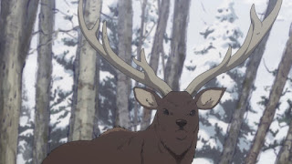 Del cual ella toma de el, Sugimoto trata de quitarla para él también tomar un poco, cuando el se impresiona de la fuerza de agarre que ella emplea al mantenerse bebiendo y sujetándose de la liana del árbol que provee la savia. Asirpa encuentra un árbol bastante rasguñado por los cuernos de un ciervo, marcado como su territorio, Asirpa saca su Sutow para hacer ruido con el y el árbol para atraer al ciervo, ella le cuenta a Sugimoto la razón de porque hay menos ciervos y demás motivos que la tribu Ainu analizan sobre ello, luego el ciervo aparece, Sugimoto se impresiona de que la técnica realmente funcionara para atraerle, y de que sea tan grande el ciervo como un caballo, Asirpa le advierte de que se mueva con cautela, pero al momento de Sugimoto prepara su arma para disparar se provoca un pequeño sonido que ahuyenta al ciervo y huye.