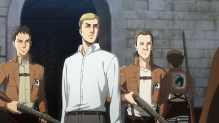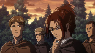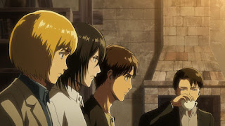 Hange y Mikasa tratan de sacarlo del cuerpo del titán pero su rostro se ve desfigurado aun asi lo sacan, Levi conversa con Armin Arlert sobre el poder de Eren en respaldo para la humanidad, Levi ordena a Historia en dar al orden de retirar a Historia en dar la orden de retirar a Eren, meintars Levi piensa en lo muy importante que es Historia sobre el misterio de los titanes en las murallas enlazado con el pasado de ella, durante la noche Levy mantiene una plática densa con Erwin sobre el pasado de Histroria Reiss y el vinculo al secreto de las muralla. Posteriormente al otro dia durante el atardecer el escuadrón 104 mantiene su grado de vigilancia cuando Eren despierta Mikasa le sugiere regresar a dormir.