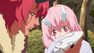 De repente, Ranga alerta a Rirumu quien rápidamente se dirige a la escena del llamado. Donde encuentra a varios ogros combatiendo contra Ranga, Gobuta y otros duendes y lobos quienes quedaron inconscientes. Con una abrumadora ventaja de parte de los ogros. Rirumu obviamente no se queda de brazos cruzados. Ordenando a Ranga y Gobuta formar una sola formación de defensa y ataque junto a él. Con la orden a Ranga de enfrentar a la chica ogro peli rosa. Entretanto el Slime combatirá contra los demás ogros.